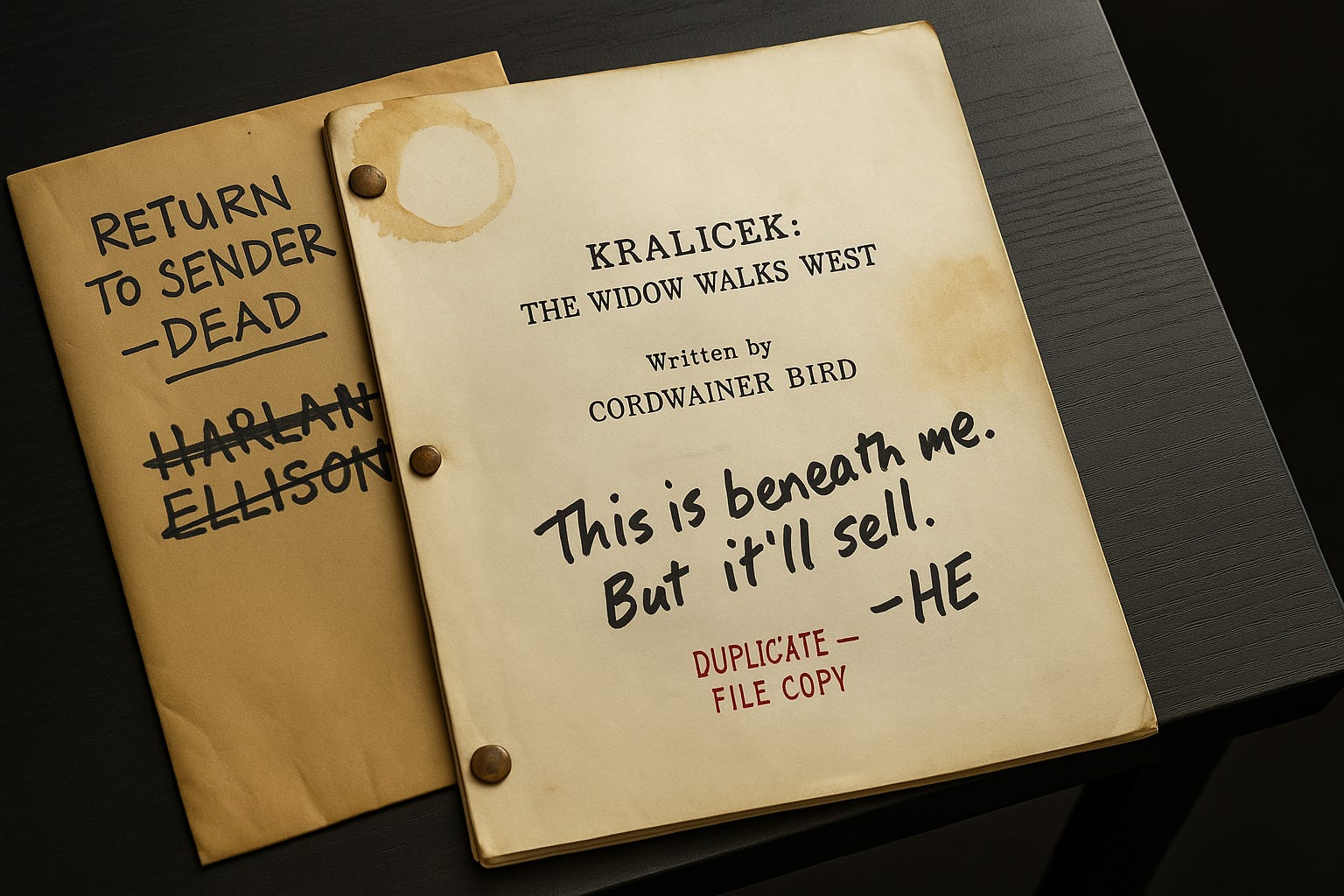 Kralicek: The Widow Walks West is a work of satire and fiction. Any resemblance to real persons, living or dead, is purely coincidental—or the result of genre archetypes gone rogue. Names, characters, places, and incidents are used fictitiously, even when they borrow from the grit of actual history. This piece was created with affection, irreverence, and no intent to defame, distort, or disturb the dead (though we wouldn’t be surprised if Harlan Ellison still sues us from the afterlife).