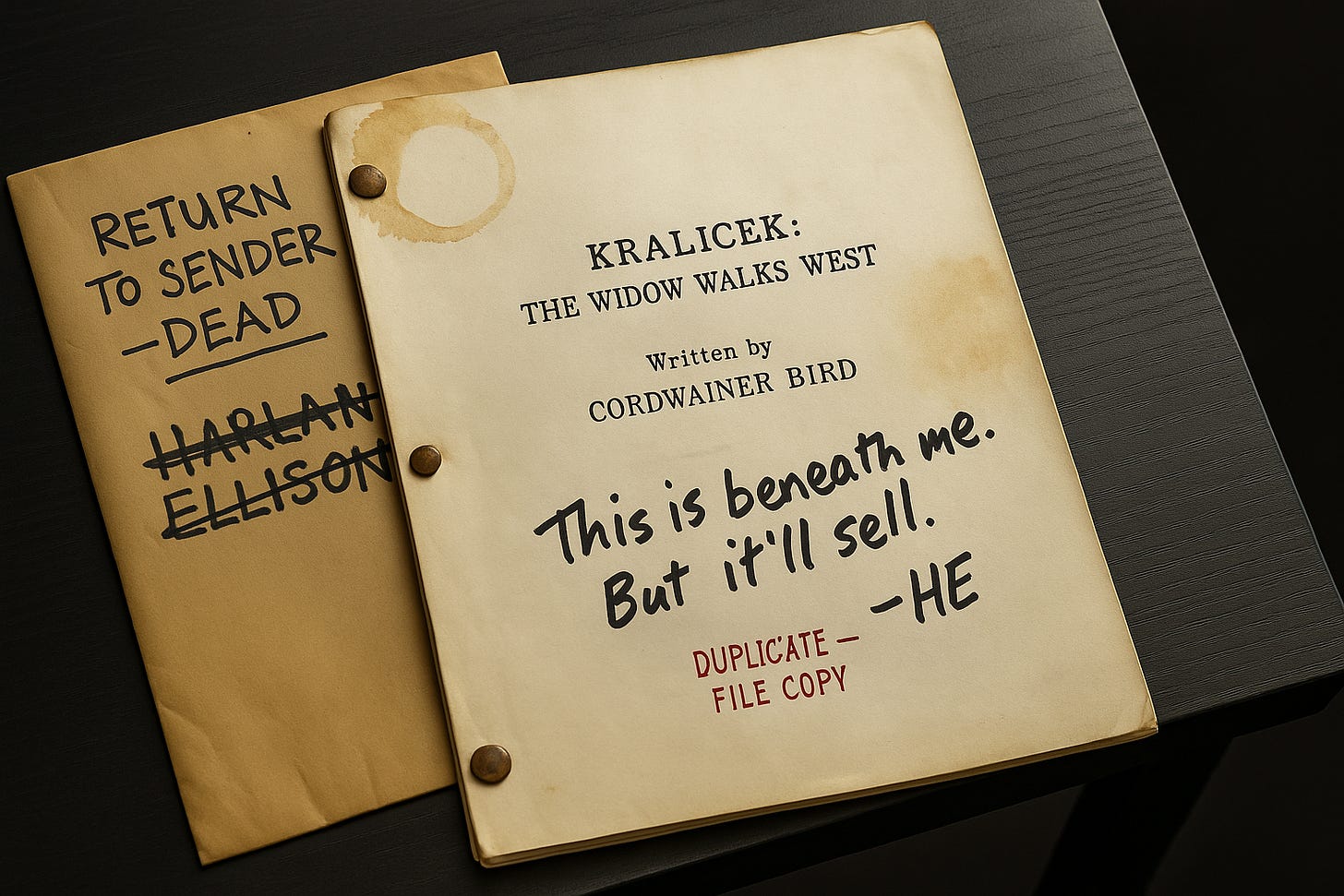 It reeked of nicotine and bourbon, a brown coffee cup ring bleeding in the corner. Scrawled in the margins in bold Sharpie: “This is beneath me. But it’ll sell. –HE” Then I saw the writing credit: “Cordwainer Bird.” This was Ellison’s famous “I’m disowning this” credit, especially on TV projects he felt were mangled (e.g., Voyage to the Bottom of the Sea, The Starlost). Ellison himself described using “Cordwainer Bird” primarily for television, with occasional magazine use “as a lark.”