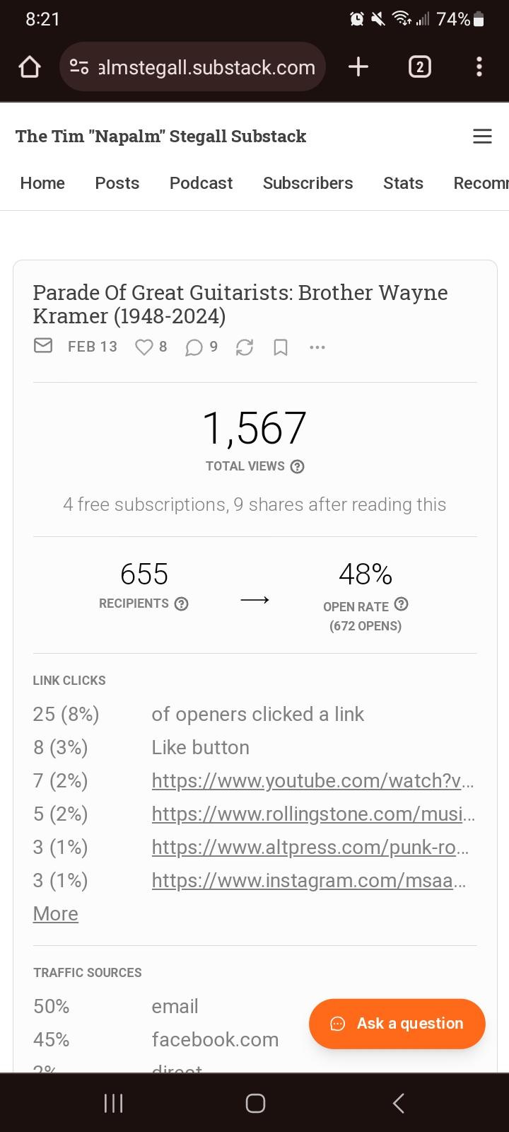 See that? As of this writing (at 8:26 PM, 2/19/24), 1,567 folks have read last week’s Wayne Kramer memorial post. That’s the most unique views any single post has generated in the history of The Tim “Napalm” Stegall Substack. Thank you so much.